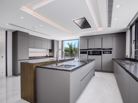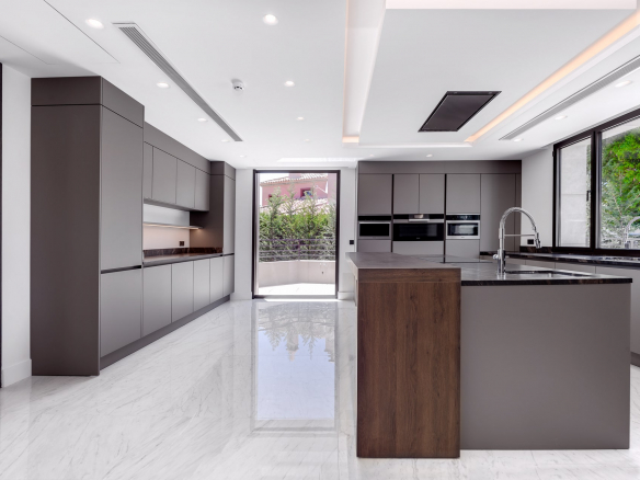 Villa California stands out for the careful selection of high quality materials that can be noticed in the bathrooms with its sanitary ware and taps signed by Philipe Starck and the elegant Siematic kitchen equipped with Gaggenau and Miele appliances.